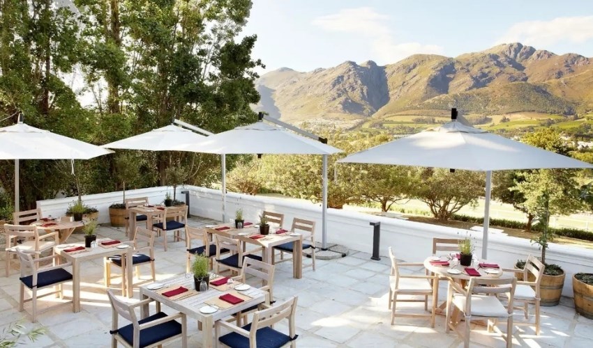 Surrounded by vines and Franschhoek mountain views, The Country Kitchen is Mont Rochelle’s informal restaurant for light lunches, wine tastings with platters, or a picnic by the vineyard dam. In the heart of the estate and adjoining the wine-tasting room (a 10-minute walk or quick shuttle ride from the luxurious Virgin Limited Edition hotel), the relaxed vineyard restaurant has white-painted reed ceilings, walls adorned by nature-inspired, cork sculptures and a sense of simplicity and light. The wide front terrace is the place to soak up sunshine and views with the whole panorama of the Franschhoek valley laid out before you.