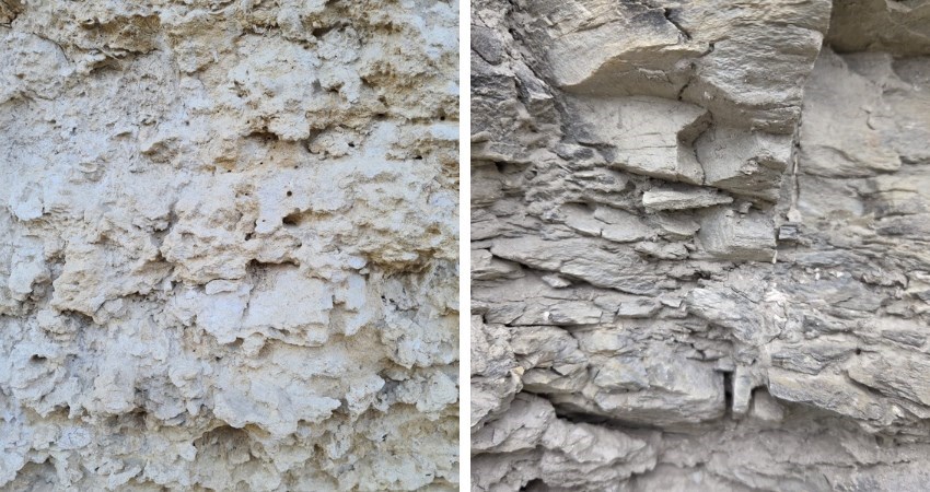 The soils are the primary stylistic driver here. Pictured: (L) Calcarenite – a sedimentary rock of sand-sized carbonate grains, predominantly calcium carbonate (calcite); (R) shale with high levels of calcium carbonate.