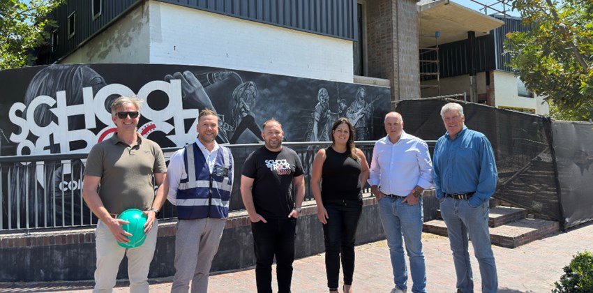 From left to right: Ryan Hunt (Hunt Properties), Las Lemmer (Squareturn Developments), Keith Taeuber (School of Rock SA), Leigh Spaun (School of Rock SA), Carlo Capri (Squareturn Developments and Cabrico), and Deon de Wet (Hunt Properties) outside the soon-to-be School of Rock Devonbosch – marking the start of a new era of music and creativity in the Cape Winelands.